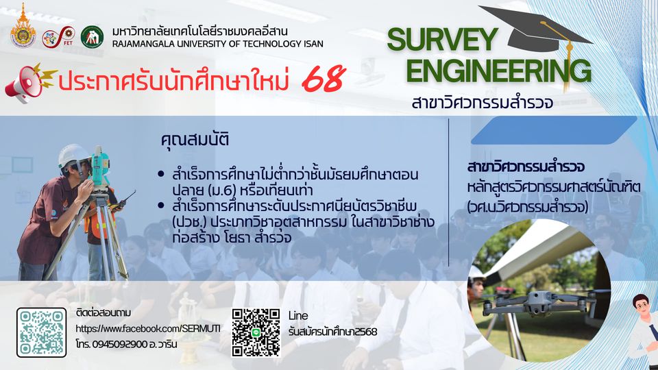 ปีการศึกษา 2568 สาขาวิศวกรรมสำรวจ ได้ปรับปรุงหลักสูตร และเปลี่ยนชื่อหลักสูตรใหม่จาก สาขาวิชาวิศวกรรมสำรวจและภูมิสารสนเทศ เป็น สาขาวิชาวิศวกรรมสำรวจ ในปีการศึกษา 2568 นี้ โดยมีการปรับโครงสร้างหน่วยกิตตลอดหลักสูตรน้อยลง จากเดิม 140 หน่วยกิต เป็น 120 หน่วยกิต เพื่อให้การเรียนการสอนกระชับเนื้อหาตรงประเด็น เน้นฝึกทักษะด้านเทคโนโลยีในสายวิชาชีพ และเป็นวิศวกรนักปฏิบัติอย่างมืออาชีพ
